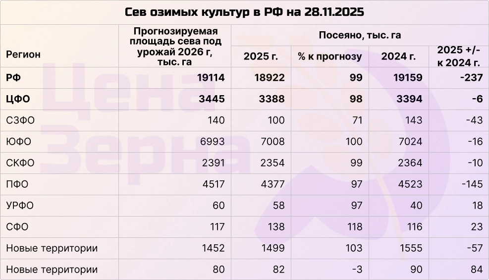 Посев озимых культур прогнозируют на площади почти 19,1 млн гектаров, что выше сева на 2025 год на 1 млн.га. Сев проходит с небольшим отставаниям по срокам из-за погодных условий, но уже фактически завершен. Наибольшие площади традиционно сосредоточены на юге — около 7 млн гектаров под озимыми культурами.