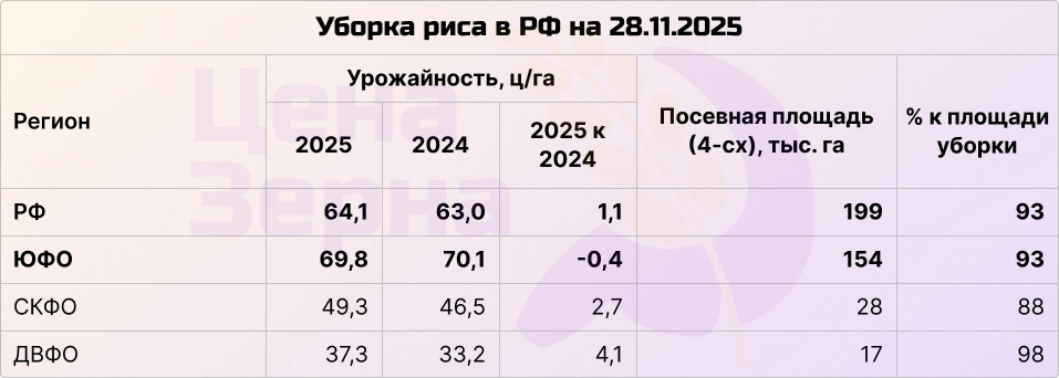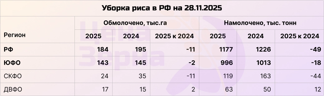 На начало ноября намолочено почти 1,2 миллион тонн риса, что соответствует 93% посевных площадей. Традиционно большая часть урожая приходится на юг страны — почти 1 миллион тонн, преимущественно в Краснодарском крае. Урожайность почти не изменилась по сравнению с прошлым годом. Под давлением производителей риса и хорошего урожая правительство все таки сняло ограничение на экспорт риса-сырца.