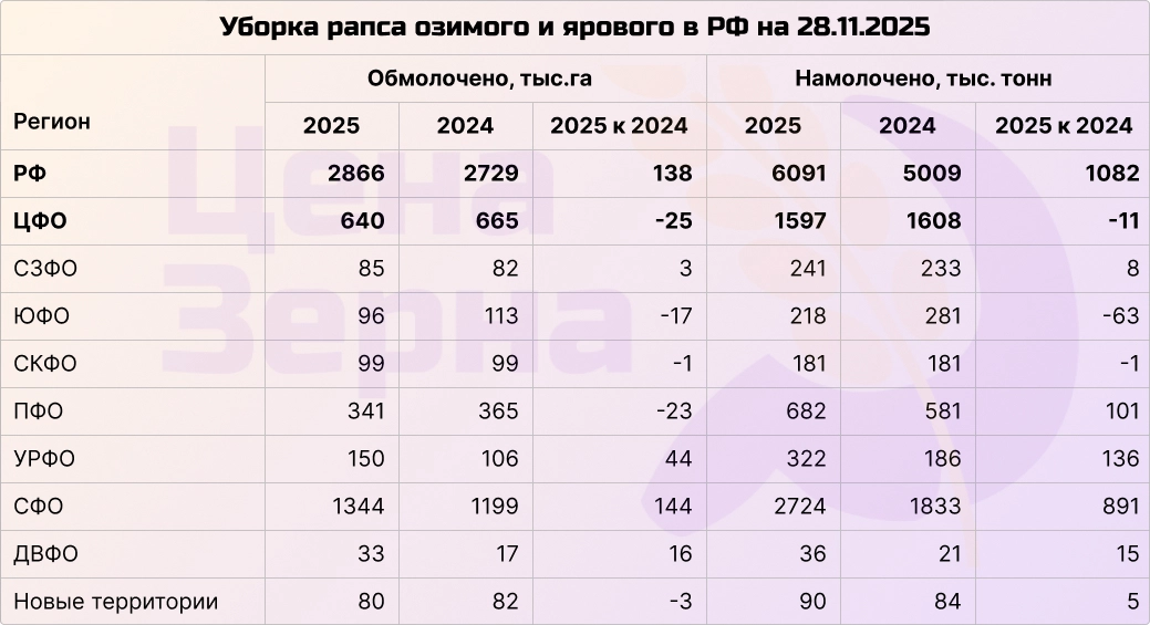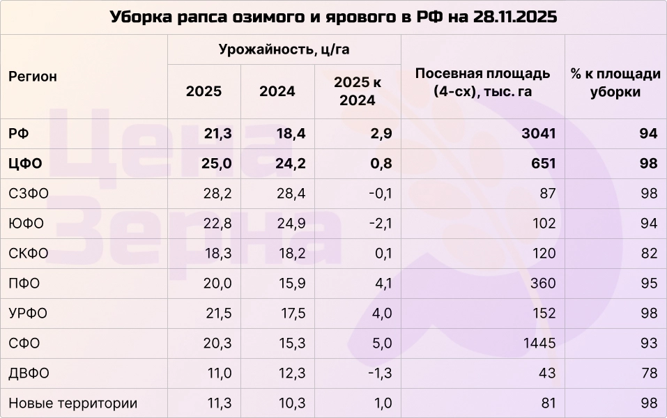 На начало ноября в РФ собрано 6 миллионов тонн рапса, что составляет около 94% от общих уборочных площадей. Уборочная кампания практически завершилась, прогнозы оправдались. Средняя урожайность по стране составляет 21,3 ц/га, что немного превышает прошлогодние показатели — 18,4 ц/га.