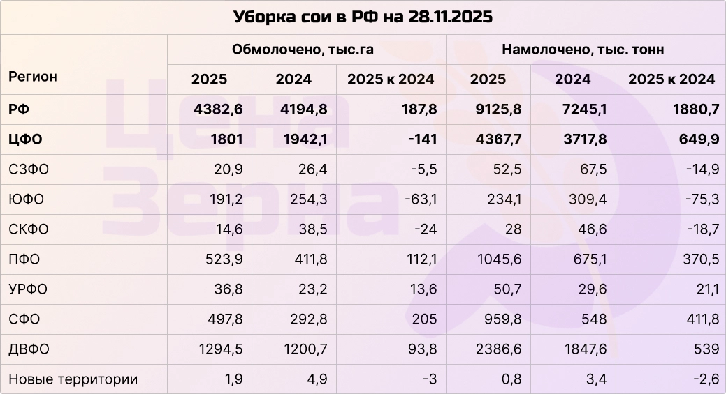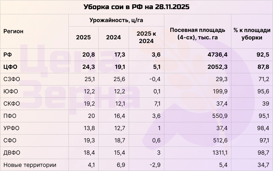 Соя демонстрирует отличные показатели урожайности: уже намолочено 9,1 миллионов тонн в бункерном весе, все ближе к прогнозу в 9,1 миллионов тонн в чистом весе. Средняя урожайность превышает 20,8 ц/га, что на 3,6 ц/га больше по сравнению с прошлым годом. Однако у этой положительной динамики есть и отрицательные стороны — переработчики значительно снизили цены на сырье.