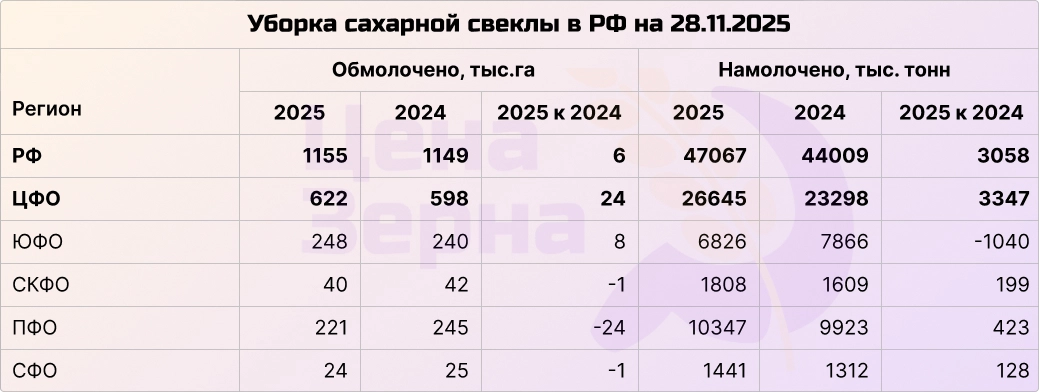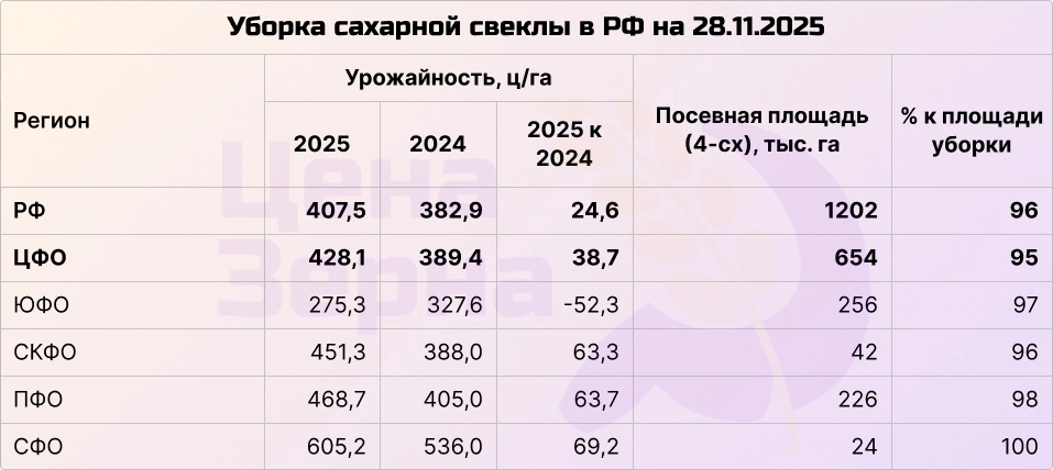 Уборка сахарной свеклы прошла без особых сюрпризов. Урожайность находится примерно на уровне прошлого года. Общая площадь уборки составила чуть более 1,1 миллиона гектаров, что соответствует 96% посевных площадей. Средняя урожайность достигла более 400 ц/га, что на 24,5 ц/га превышает показатель прошлого года. Традиционно для этого сезона, снижение урожайности наблюдается только в ЮФО.