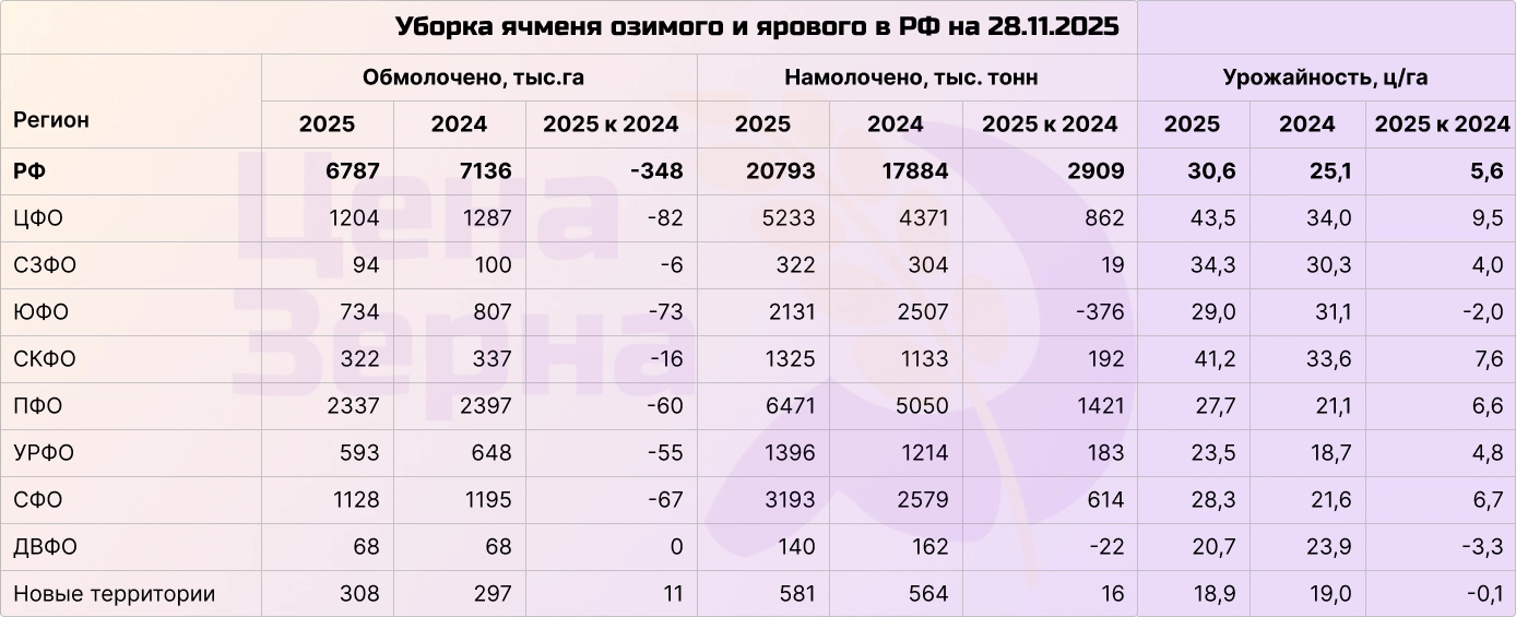 Ячмень практически полностью убран с полей, осталось не более 3%. Средняя урожайность превышает 30,6 ц/га, а общий намолоченный объем уже превысил 20,8 миллионов тонн. Урожай оценивается как хороший: даже на юге показатели урожайности лишь немного уступают прошлогодним. В этом году рынок ячменя демонстрирует стабильность и уверенные позиции.
