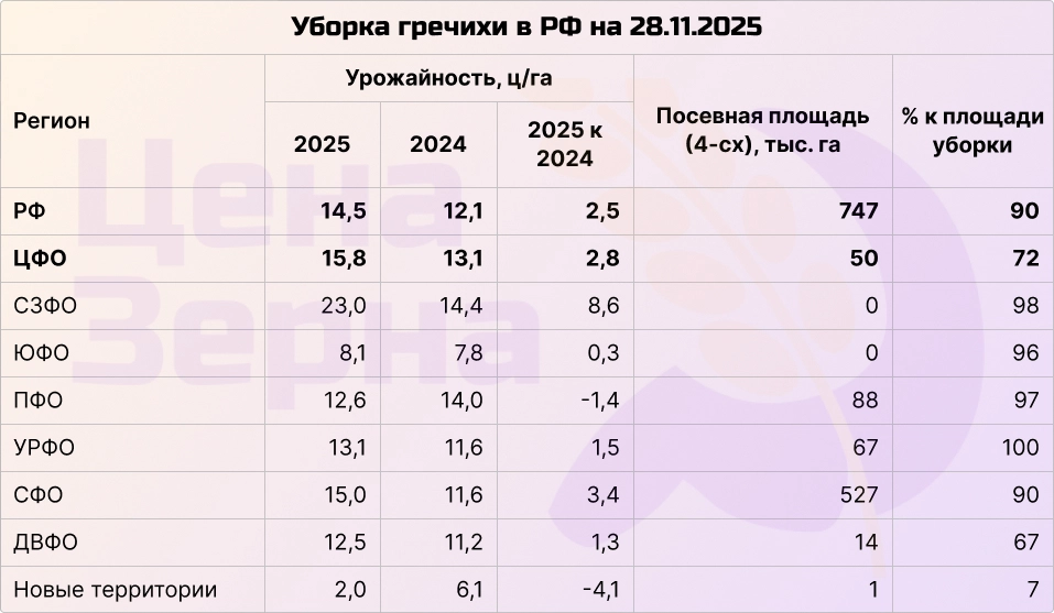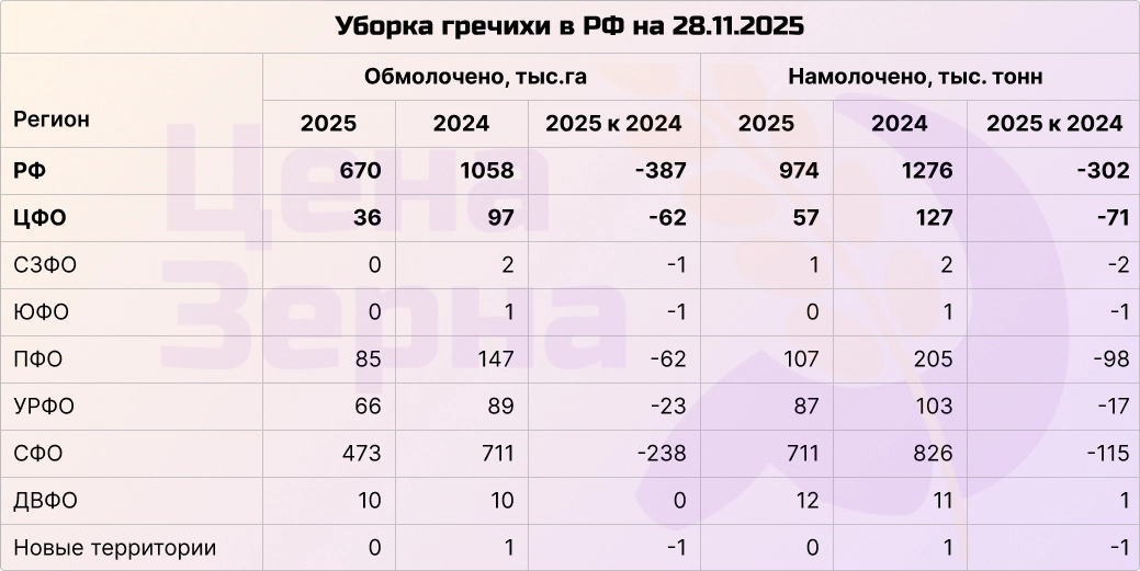 Уборка гречихи практически завершена: на сегодняшний день собрано почти миллион тонн зерна при обработке около 90% посевных площадей. Основные объемы традиционно собираются в Сибири. Процесс идет без существенных осложнений: урожайность немного выше прошлогодней, однако темпы сбора в два раза ниже из‑за неблагоприятных погодных условий, замедляющих работу.