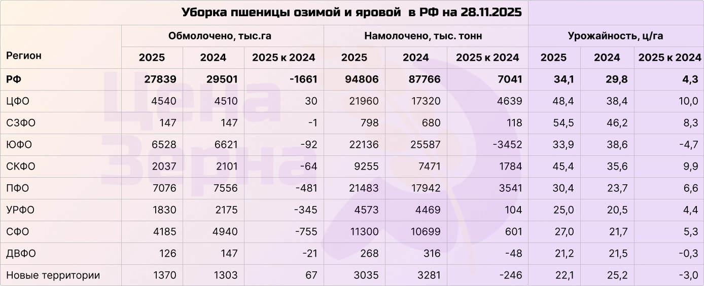 Уборка пшеницы считается завершенной, несмотря на некоторые статистические погрешности. Намолочено более 95 миллионов тонн в бункерном весе; окончательные данные ещё уточняются, однако прогноз в 90 миллионов тонн, судя по всему, оказался верным. Средняя урожайность по стране превысила показатели прошлого года и составила 34,1 ц/га, что на 4,3 ц/га больше 2024 года.