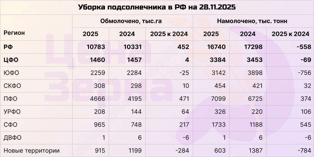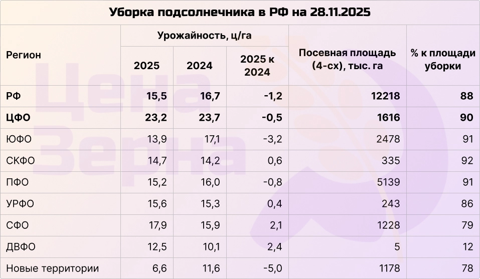 Уборка подсолнечника осложняется ухудшением погоды в северных и восточных регионах страны. Большая часть территории России уже покрыта снегом, что вынуждает аграриев оставить часть уборки на весну. Намолочено почти 16,8 млн.т семечки в бункерном весе, аналитические центры снижают прогнозы сбора урожая. Средняя урожайность ниже прошлогодней на 1,2 ц/га и составляет 15,4 ц/га. При этом темпы уборки немного выше, чем годом ранее. Центр, Поволжье и Юг демострируют снижение урожайности, являясь основными поставщиками. Низкий урожай стимулирует рост цен на масло.