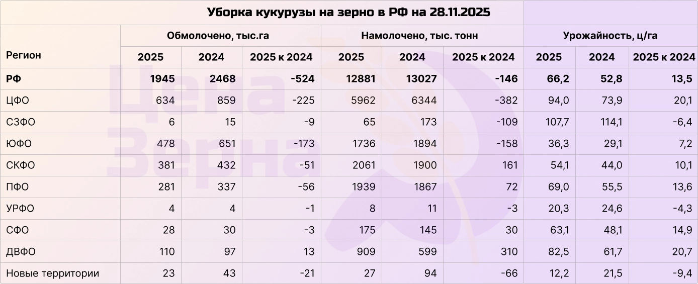 Уборка кукурузы продолжается в активной стадии, уже убрано почти 70% посевных площадей. Намолочено почти 13 миллионов тонн зерна с площади около 2 миллионов гектаров. Текущие показатели по-прежнему опережают прошлогодние: средняя урожайность немного выросла и уже составляет 66,2 ц/га, что почти на 13,5 центнеров выше уровня прошлого сезона. В то же время, пока фиксируются потери урожайности только на новых территориях и на Урале, в остальных регионах урожай демонстрирует лучшие результаты по сравнению с предыдущим годом.
