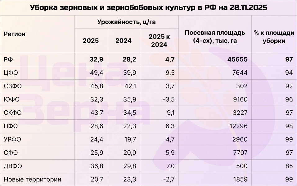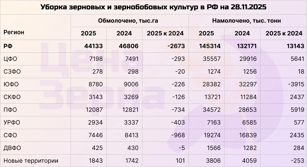 К зиме урожай зерна в России показывает достойные результаты — свыше 145 миллионов тонн в бункерном весе, что на 13,2 миллиона тонн больше по сравнению с аналогичной датой прошлого года. Традиционно наибольшие урожаи собраны на Юге, в Центре и Поволжье. В настоящее время уборочные работы почти завершены: осталось собрать менее 3% посевных площадей. В некоторых районах погодные условия затрудняют сбор поздних культур, поэтому уборка этих полей запланирована на весну.