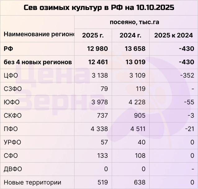 Посев озимых культур прогнозируют на площади почти 20 млн гектаров. Уже засеяно более 13 млн гектаров. Наибольшие площади традиционно сосредоточены на юге — около 7 млн гектаров под озимыми культурами.