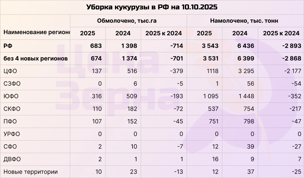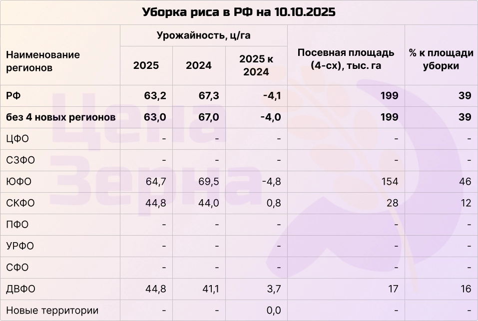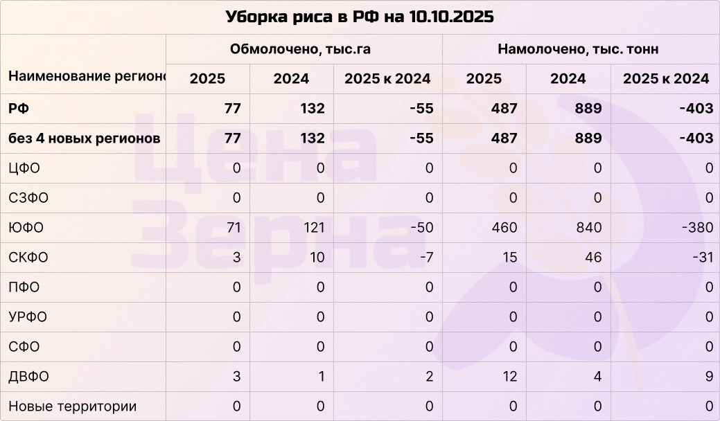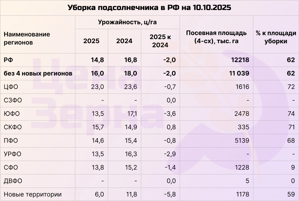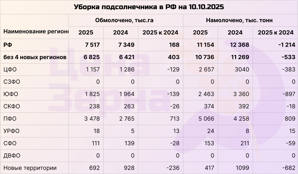 Ситуация с подсолнечником остается тревожной. Уборка идет немного быстрее, чем в прошлом году, что удивительно для текущего сезона. Однако урожай хуже прошлогоднего результата, особенно на юге страны. Маслозаводы вынуждены закупать сырье в Центральном и Поволжском федеральных округах. Аграрии не идут на уступки, надеясь компенсировать потери. В среднем с гектара собирают около 15 центнеров семян подсолнечника, что ниже прошлогодних 17 центнеров.