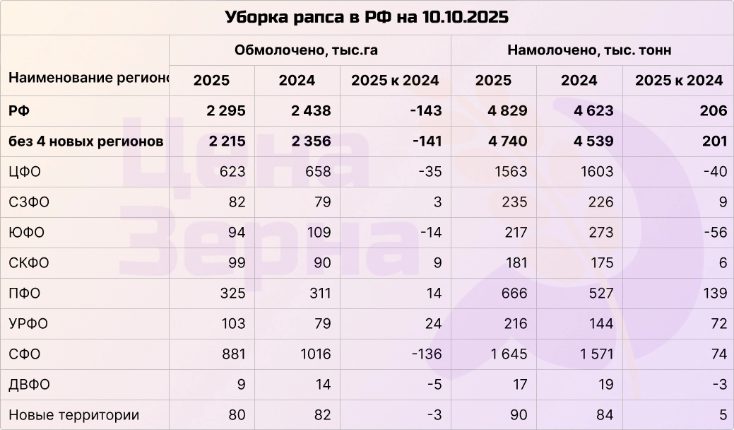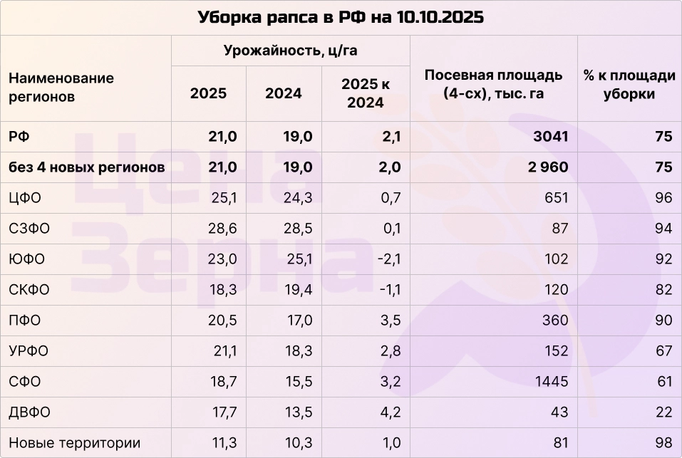 На середину октября в РФ собрано почти 4,8 млн.тонн рапса, что составляет почти 75% уборочных площадей. В Центральном федеральном округе сбор урожая почти завершен (96%), а в Сибири — чуть больше 60%. Прогнозируемый общий урожай составляет около 5,5 млн тонн в зачетном весе. Урожайность в Сибири находится на рекордном уровне, сопоставимом с показателями 2023 года. Средняя же урожайность по стране составляет 21,0 ц/га, что немного выше прошлогодгних 19,0 ц/га.