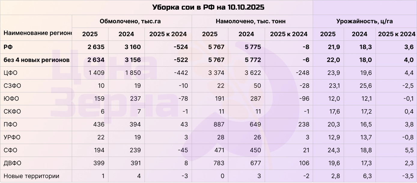 Ситуация с соей значительно улучшилась. Экватор уборки уже пройден, и эксперты прогнозируют рекордный урожай — более 9 миллионов тонн. В ответ на это переработчики начали снижать цены на сырье. На сегодняшний день собрано почти 6 миллионов тонн сои — столько же, сколько и в прошлом году, несмотря на отставание на 500 тысяч гектаров. Урожайность составляет 22 ц/га, что почти на 4 ц/га больше, чем в прошлом году.