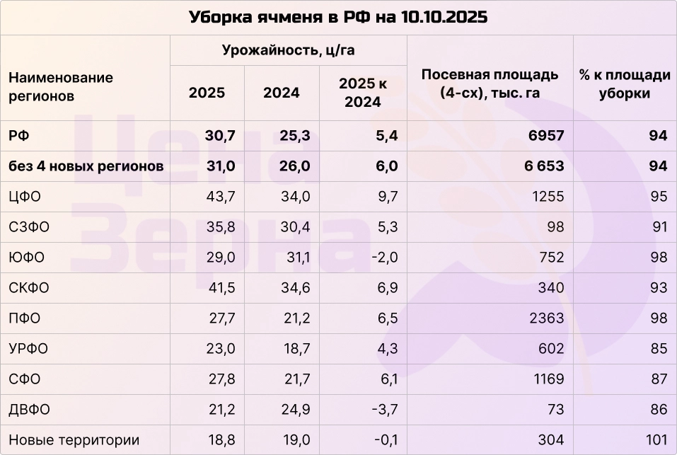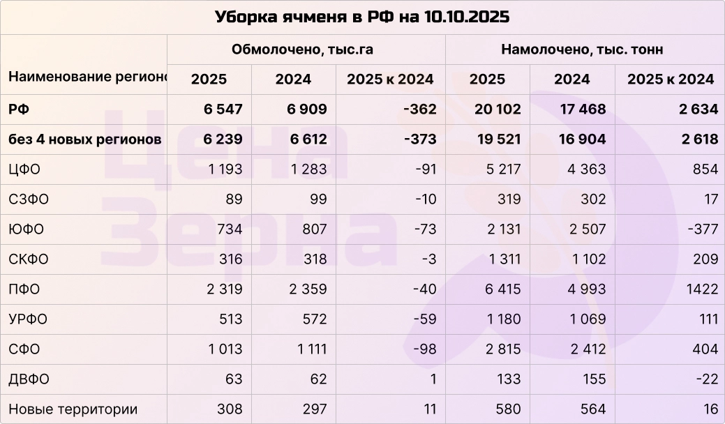 Ячмень также практически полностью собран. Средняя урожайность превышает 30,5 ц/га, а общий намолоченный объем уже превысил 20 миллионов тонн. Урожай оценивается как хороший: даже на юге показатели урожайности лишь немного уступают прошлогодним. В этом году рынок ячменя демонстрирует стабильность и уверенные позиции.