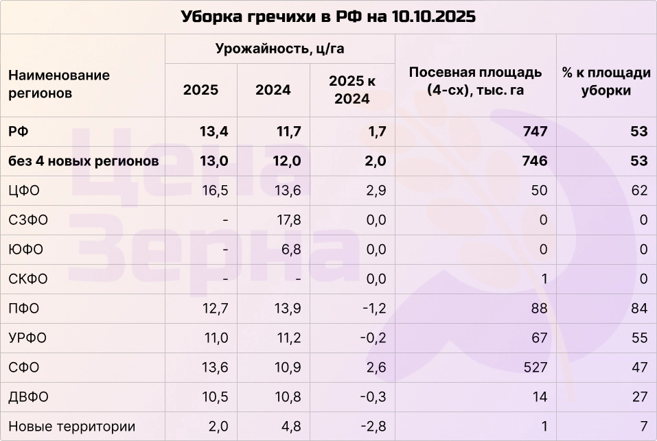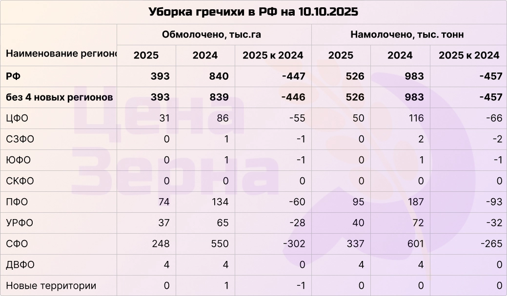 Уборка гречихи также ведется в активной фазе. На сегодняшний день намолочено более полумиллиона тонн при обработке около 50% посевных площадей. Основной урожай традиционно собирается в Сибири. Прохождение уборочных работ идет без сюрпризов: урожайность примерно такая же, как и в прошлом году, однако темпы в два раза ниже из-за неблагоприятных погодных условий, замедляющих процесс.
