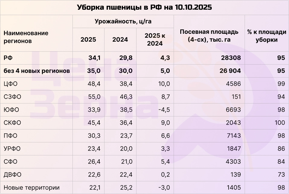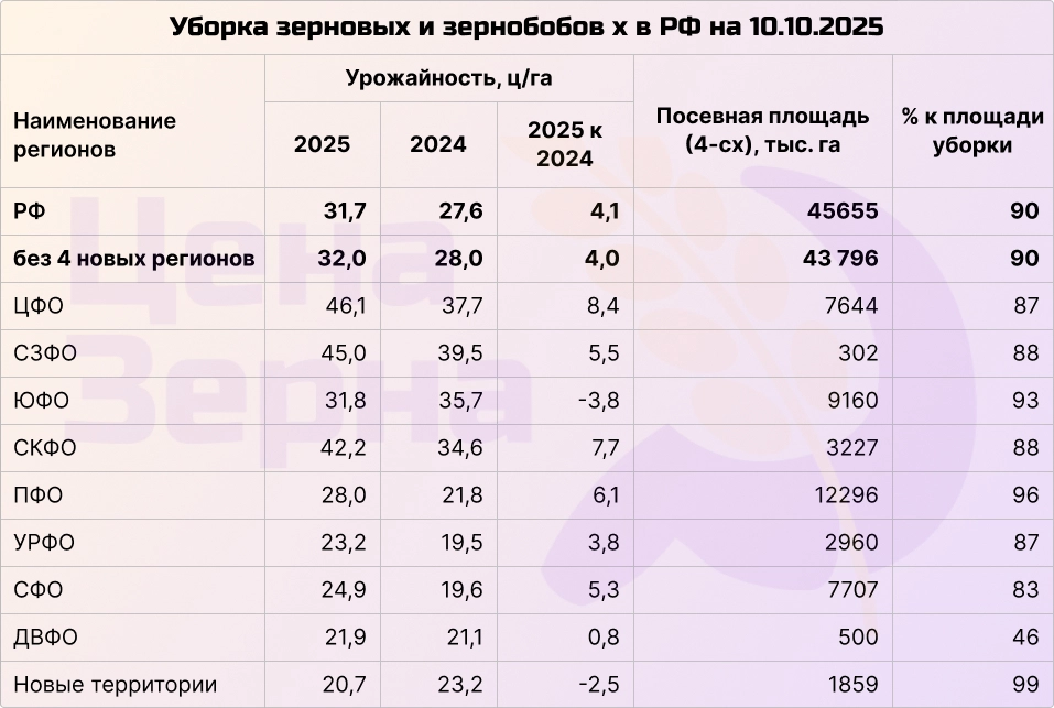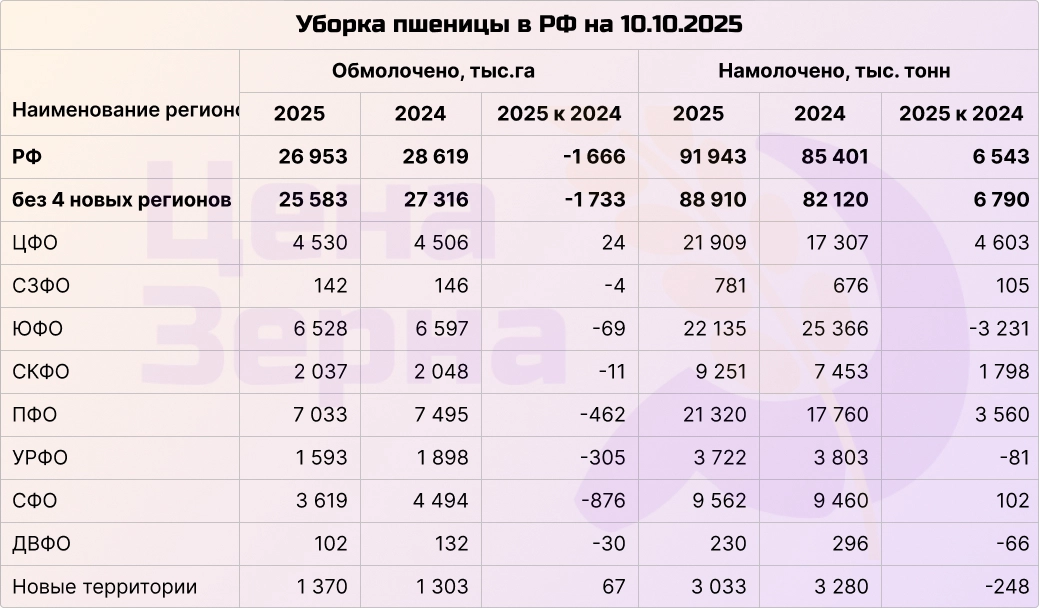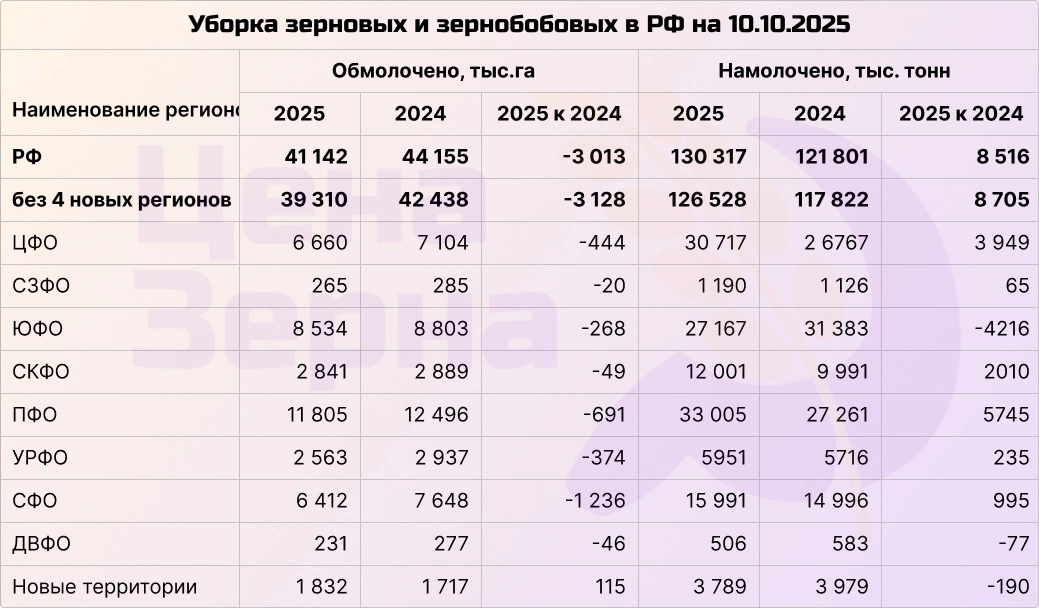 На прошлой неделе урожайная кампания превысила 130 миллионов тонн, об этом поспешили сообщить представители Минсельхоза РФ. Оксана Лут подтвердила, что с 90% посевных площадей удалось собрать около 130 млн тонн зерна. Уборка находится на завершающей стадии во всех регионах, однако темпы значительно замедляются из‑за неблагоприятных погодных условий. В Приуралье и Сибири осадки мешают выходу техники в поля. На Дальнем Востоке уборка тоже идет с задержками. Уже обмолочено более 41 миллиона гектаров. Остается завершить сбор оставшихся 10% площадей для полного подведения итогов сезона.