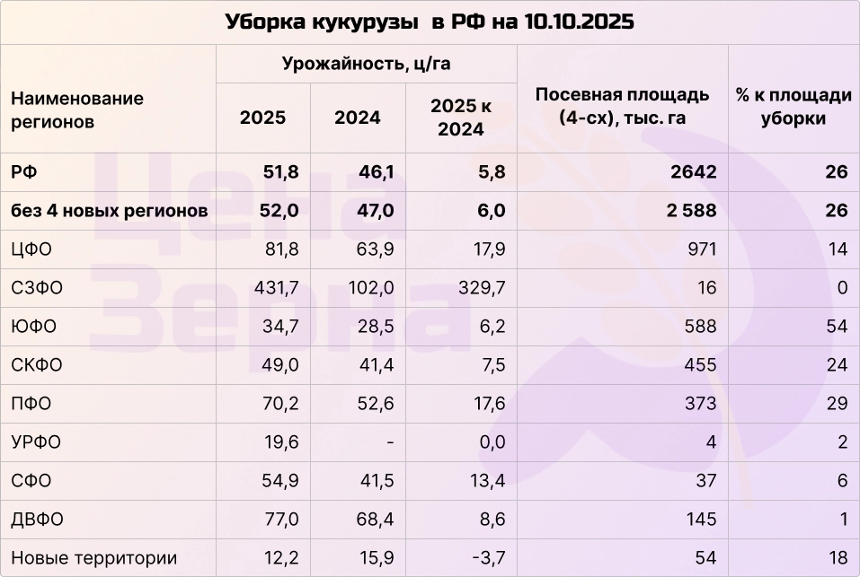 Уборка кукурузы продолжается в активной фазе. Уже убрана около четверти посевных площадей. Намолочено более 3,5 млн.т. Показатели по-прежнему превосходят прошлогодние. Средняя урожайность по стране составляет почти 52 ц/га — это почти на 7 ц/га выше уровня прошлого сезона. Пока что потери урожайности фиксируются только на новых территориях. В остальных регионах урожай показывает лучшие результаты по сравнению с прошлым годом. В Европе ожидают рекордный урожай кукурузы, несмотря на то, что эта культура не является основной в регионе.