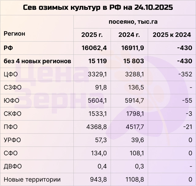 Посев озимых культур прогнозируют на площади почти 20 млн гектаров. Уже засеяно более 16 млн гектаров. Наибольшие площади традиционно сосредоточены на юге — около 7 млн гектаров под озимыми культурами.