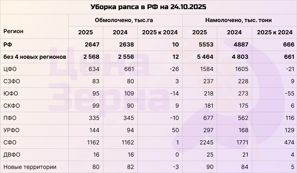 На середину октября в РФ собрано почти 5,5 миллионов тонн рапса, что составляет около 87% от общих уборочных площадей. Уборочная кампания приближается к завершению, и прогнозы оправдались. В Центральном федеральном округе сбор урожая практически завершен — 97%, а в Сибири уборка завершена уже более чем на 80%. Средняя урожайность по стране составляет 21,0 ц/га, что немного превышает прошлогодние показатели — 18,5 ц/га.