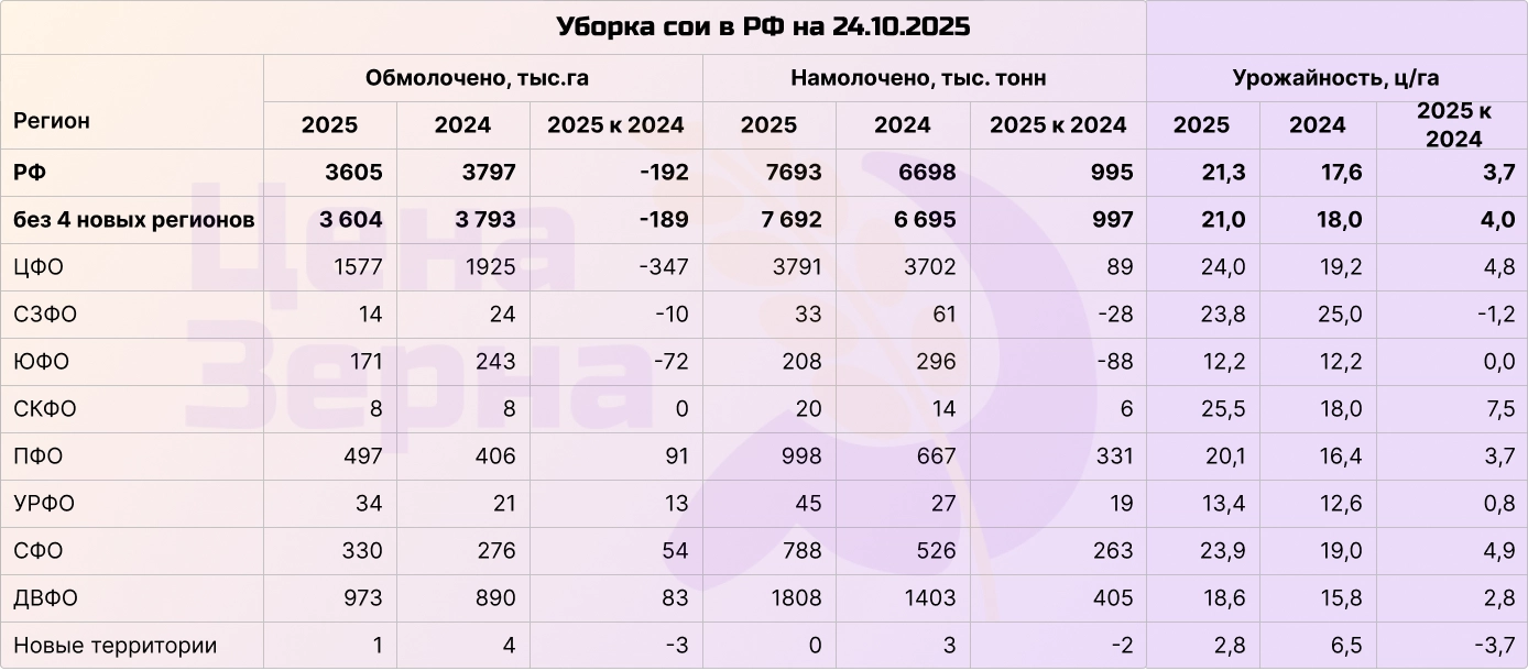 Соя демонстрирует отличные показатели урожайности: уже намолочено 7,7 миллионов тонн, а прогноз в 9 миллионов тонн выглядит вполне достижимым. Средняя урожайность превышает 21,3 ц/га, что на 3,7 ц/га больше по сравнению с прошлым годом. Однако у этой положительной динамики есть и отрицательные стороны — переработчики значительно снизили цены на сырье.