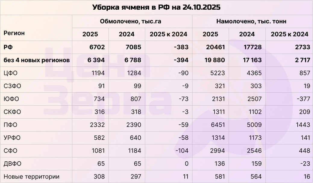 Ячмень практически убран с полей. Средняя урожайность превышает 30,5 ц/га, а общий намолоченный объем уже превысил 20 миллионов тонн. Урожай оценивается как хороший: даже на юге показатели урожайности лишь немного уступают прошлогодним. В этом году рынок ячменя демонстрирует стабильность и уверенные позиции.