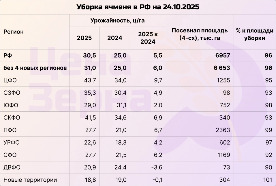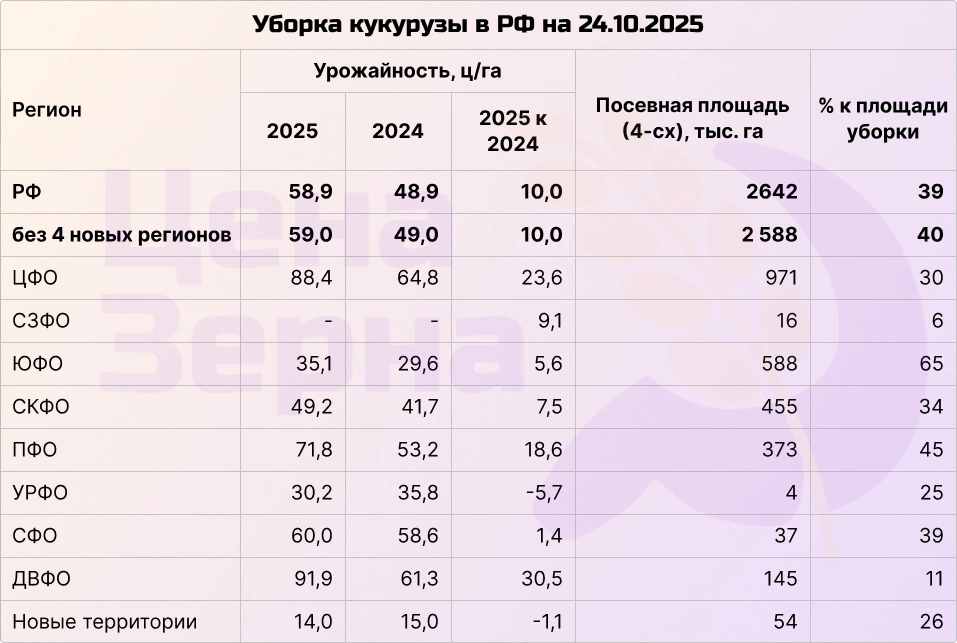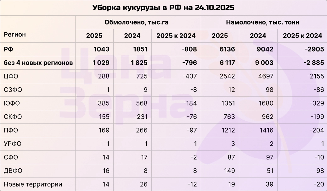 Уборка кукурузы продолжается в активной стадии, уже убрана почти половина. Намолочено более 6 миллионов тонн зерна с площади около 1 миллиона гектаров. Текущие показатели по-прежнему опережают прошлогодние: средняя урожайность по стране достигает почти 59 ц/га, что на 10 центнеров выше уровня прошлого сезона. В то же время, пока фиксируются потери урожайности только на новых территориях и на Урале, в остальных регионах урожай демонстрирует лучшие результаты по сравнению с предыдущим годом.