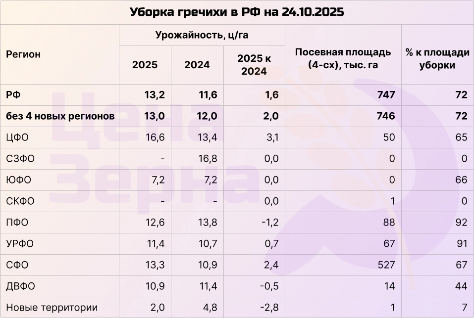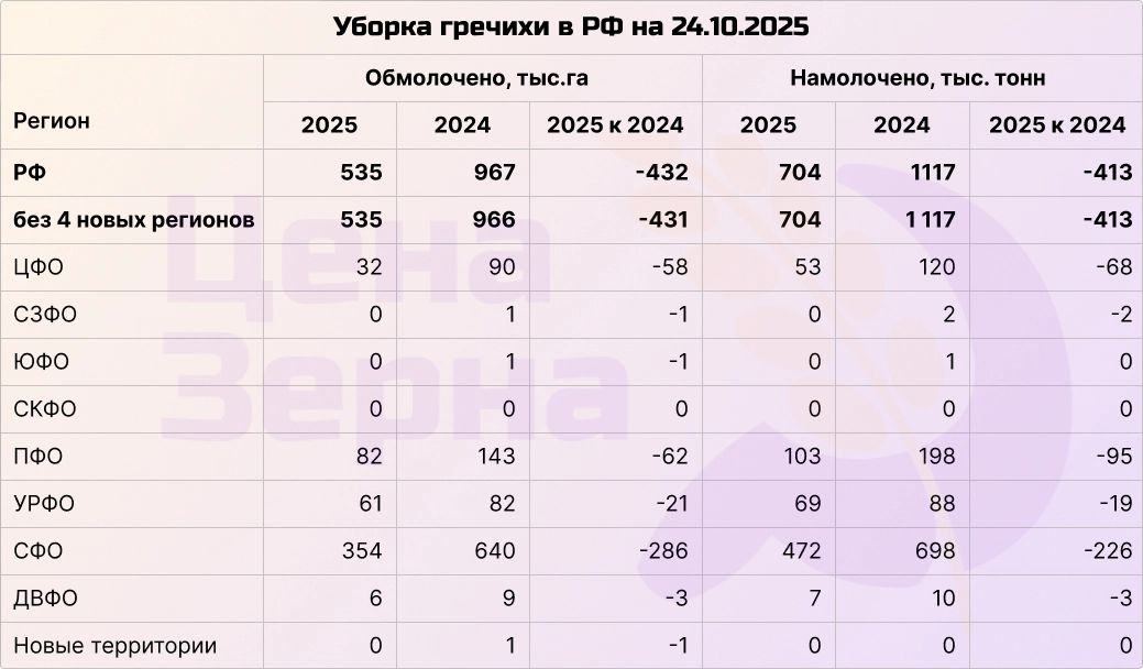 Уборка гречихи продолжается активно: на сегодняшний день собрано свыше 700 тысяч тонн зерна при обработке около 75% посевных площадей. Основные объемы собираются в Сибири. Процесс идет без существенных осложнений: урожайность примерно совпадает с прошлогодней, однако темпы сбора в два раза ниже из‑за неблагоприятных погодных условий, замедляющих работу.