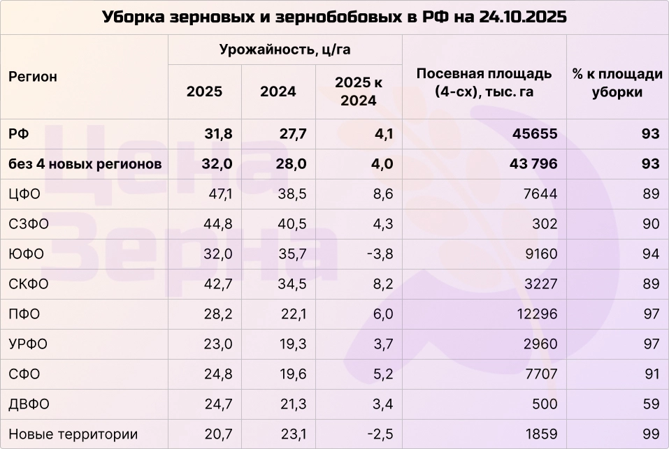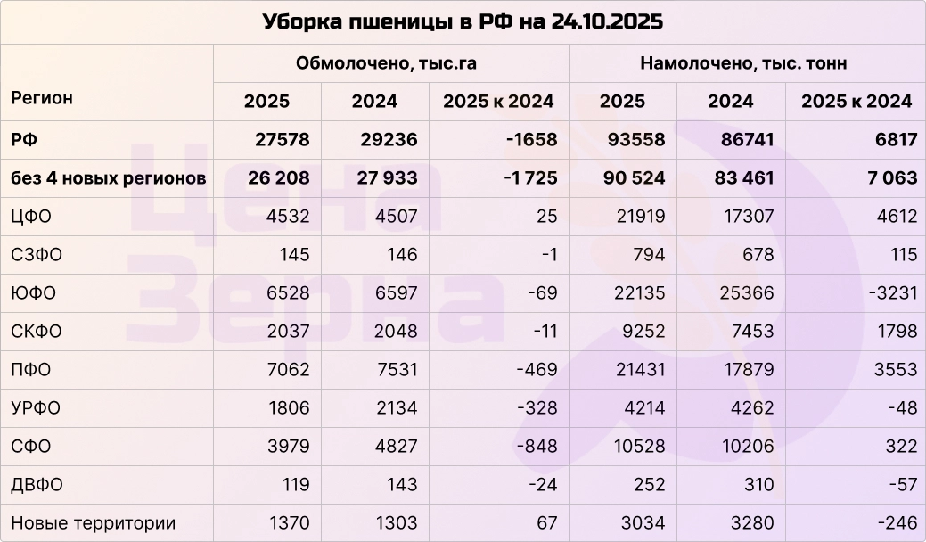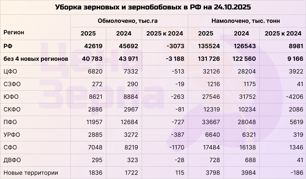 К концу прошлой недели Минсельхоз сообщил о сборе около 135 миллионов тонн зерна в бункерном весе, что на 9 миллионов тонн превышает показатели прошлого года. В чистом весе этот показатель составляет примерно 127 миллионов тонн при покрытии 93% посевных площадей. В том числе собрано 93,5 миллиона тонн пшеницы (+7,8%) и 20,5 миллиона тонн ячменя (+15,4%). Обмолочено 42,5 миллиона гектаров, при этом урожайность выросла на 15%. Ожидаемый общий урожай к концу сезона составит около 135 миллионов тонн в чистом весе, из которых примерно 90 миллионов тонн — пшеница и свыше 7 миллионов тонн — зернобобовые культуры. Эти объемы обеспечат не только внутренний рынок, но и экспорт более чем 50 миллионов тонн зерна.