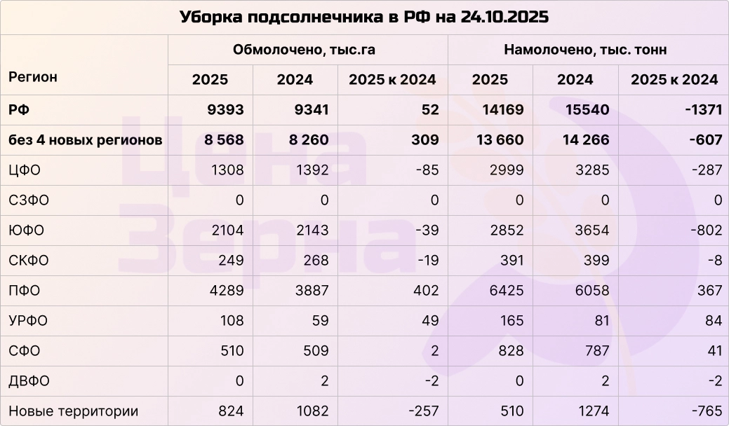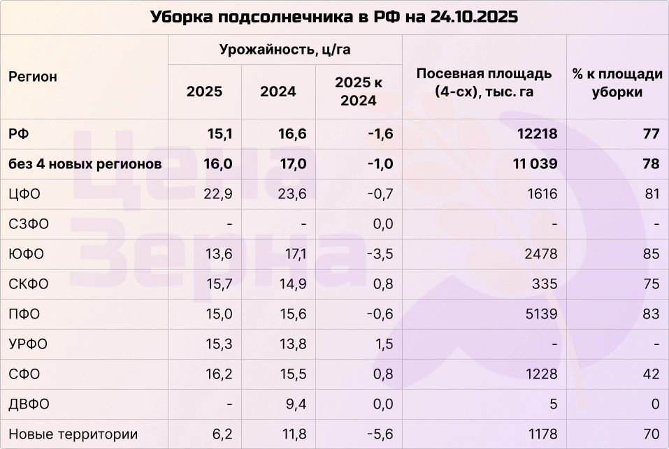 Подсолнечник немного выравнивается по результатам с показателями прошлого сезона. Темпы уборки остаются на уровне, урожайность составляет 15,1 ц/га по сравнению с 16,6 ц/га в прошлом году — разница снизилась по сравнению с сентябрем. Уже убрано более 77% посевных площадей. Намолочено более 14 миллионов тонн семян, тогда как годом ранее объем был на 1,5 миллиона тонн больше. Заводы пытаются сдерживать цены на семечку за счет закупок в центральной полосе, где урожай показывает значительно лучшие показатели.