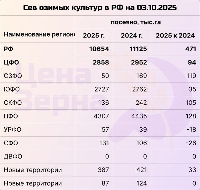 Посев озимых культур прогнозируют на площади почти 20 млн гектаров. Уже засеяно более 10,5 млн гектаров — озимый посев перешел экватор. Наибольшие площади традиционно сосредоточены на юге — около 7 млн гектаров под озимыми культурами.