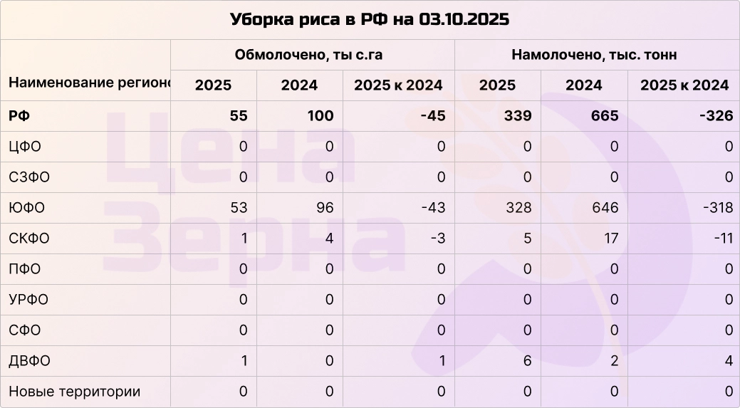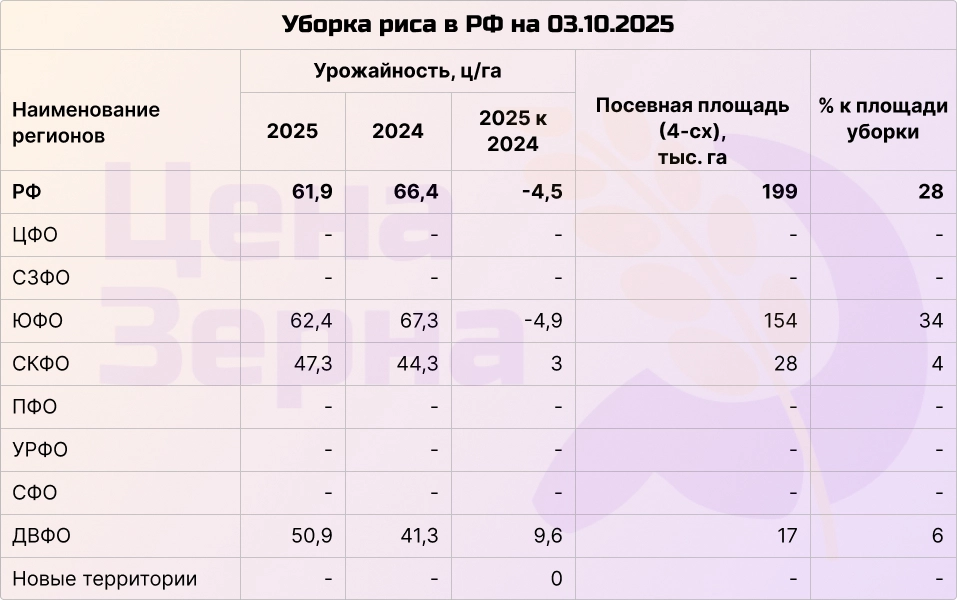 Уборка достигла около 40%, на начало октября собрано 4,3 млн.т с рекордной урожайностью 22 ц/га. В Центре и Поволжье убрано более 50%, хорошие результаты также в Сибири и на Дальнем Востоке. Прогноз производства в РФ может повыситься до 8,35–8,4 млн.т.