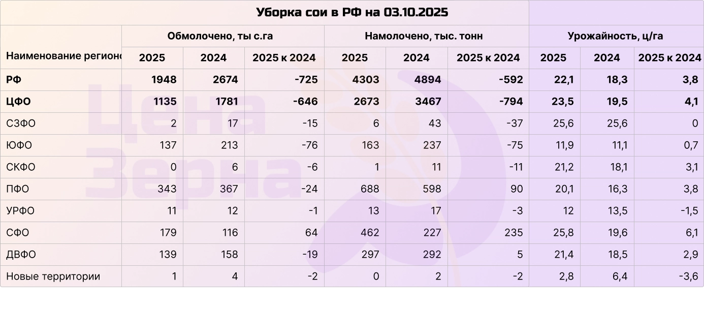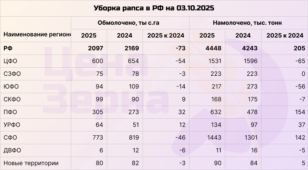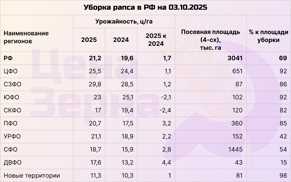 На начало октября в РФ собрано почти 4,5 млн тонн рапса, что составляет почти 70% уборочных площадей. В Центральном федеральном округе сбор урожая почти завершен (92%), а в Сибири — чуть больше 50%. Прогнозируемый общий урожай составляет около 5,5 млн тонн в зачетном весе. Урожайность в Сибири находится на рекордном уровне, сопоставимом с показателями 2023 года. Средняя же урожайность по стране составляет 21,2 ц/га, что немного выше прошлогодгних 19,6 ц/га.