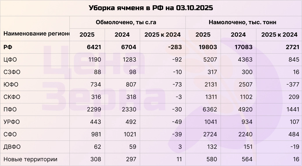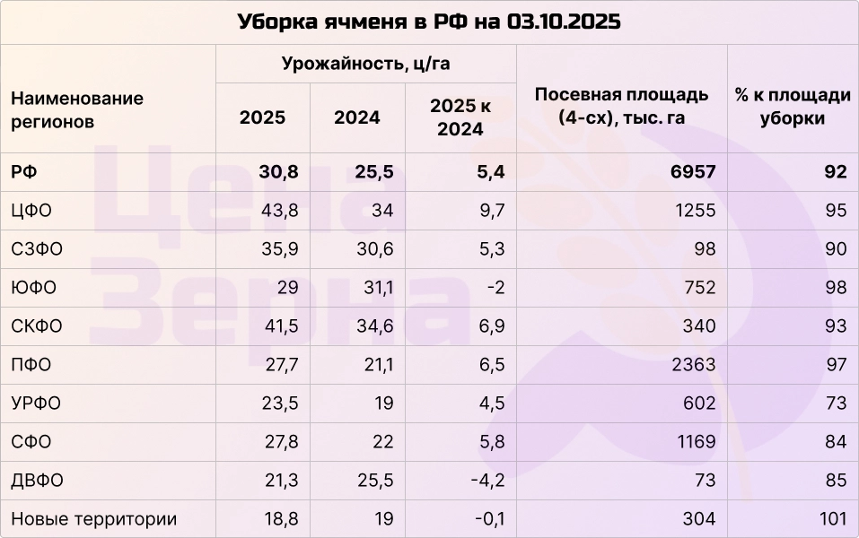 Ячмень также практически полностью убран. Урожайность составляет более 30,5 ц/га, общий намолоченный объем приближается к 20 млн тонн. Урожай оценивается как хороший, при этом даже на юге урожайность лишь немного уступает прошлогодней. В этом году рынок ячменя демонстрирует стабильность и уверенные позиции.