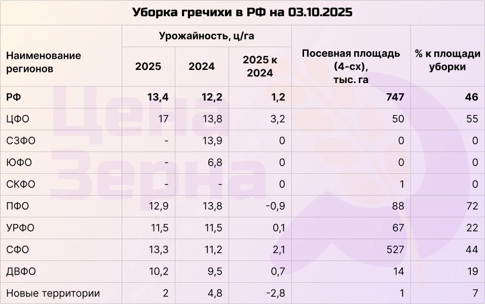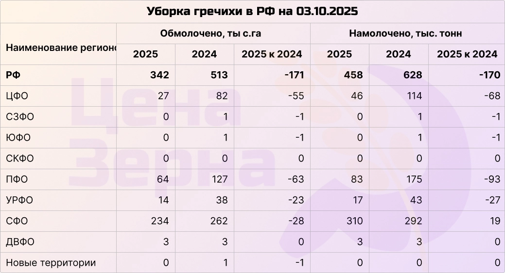 Ценители экзотики активно собирают гречиху. Уже убрана около четверти посевных площадей. Намолочено более 460 тысяч тонн при средней урожайности около 14 ц/га. Урожайность немного превышает прошлогодние показатели, однако в целом этот сезон для гречихи проходит без существенных потрясений.