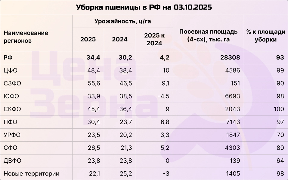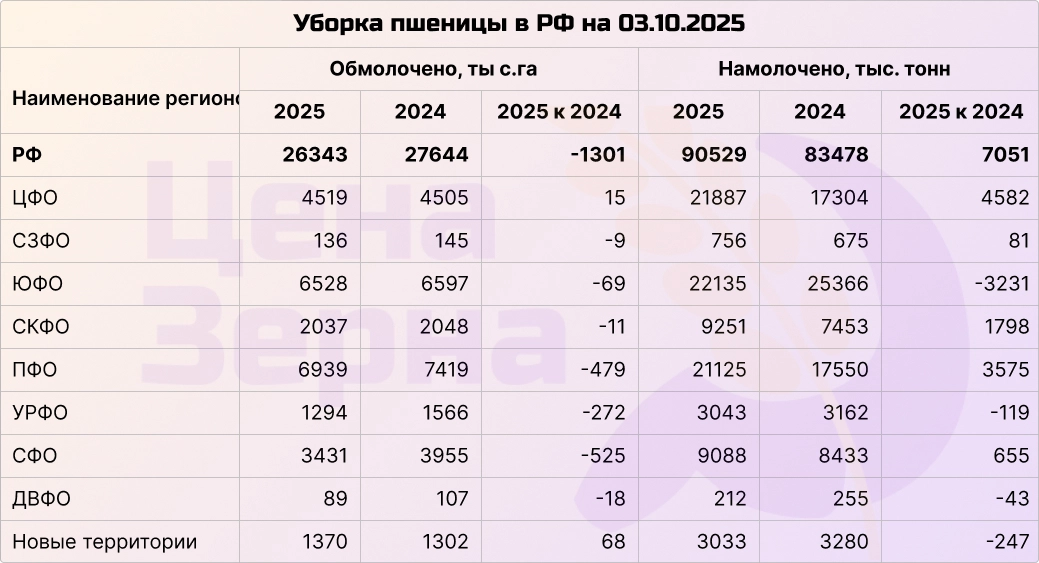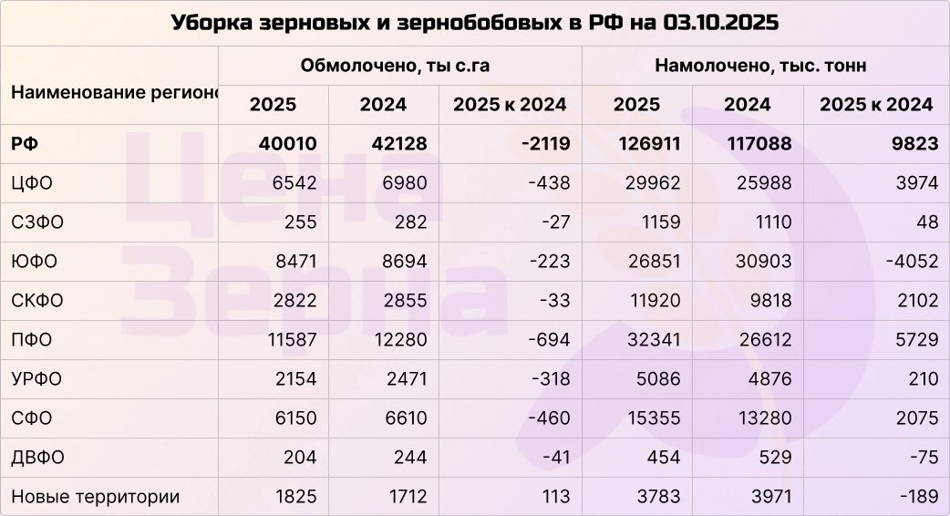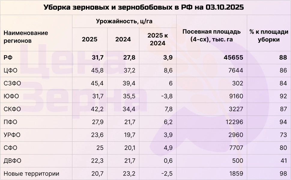 На начало октября сбор зерновых и бобовых культур превысил отметку в 127 млн тонн. До прогнозируемых Минсельхозом РФ 135 млн тонн осталось собрать около 7 млн тонн. При этом осталось убрать примерно 10% посевных площадей, а уже собрано почти столько же, сколько за весь прошлый сезон. Средняя урожайность составила 31,7 ц/га, что выше 27,8 ц/га в прошлом году.
