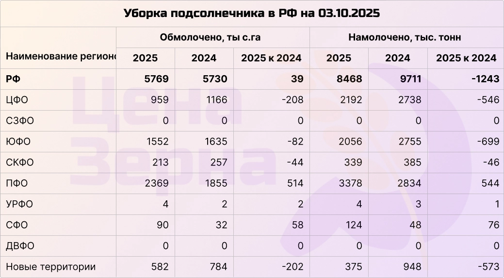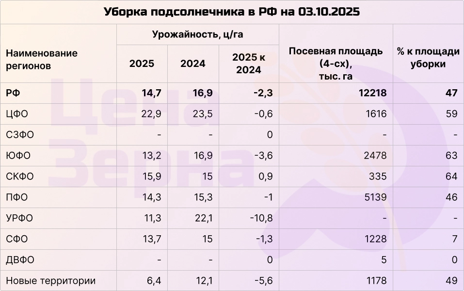 По ситуации с семечкой наблюдается сложная ситуация: урожай в основном низкий из-за проблем на Юге, несмотря на то, что в ЮФО урожай превышает 13 ц/га. В ПФО урожай ниже ожидаемых результатов — около 14,3 ц/га на первую половину посевных площадей, что негативно влияет на общую оценку урожая. Уборочные работы в Сибири и на Урале начались недавно.