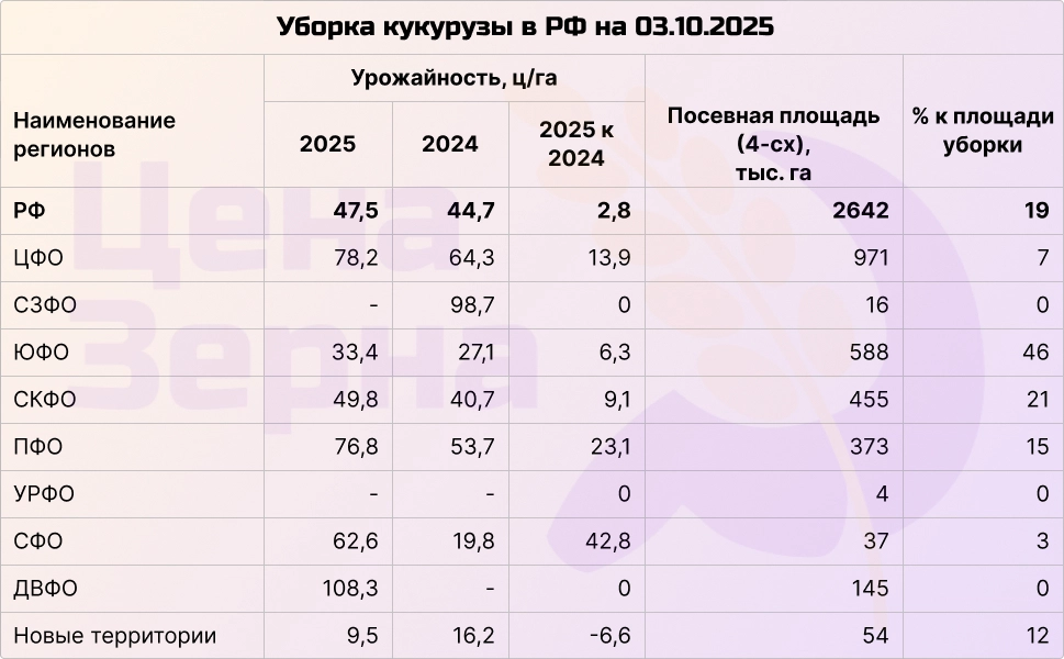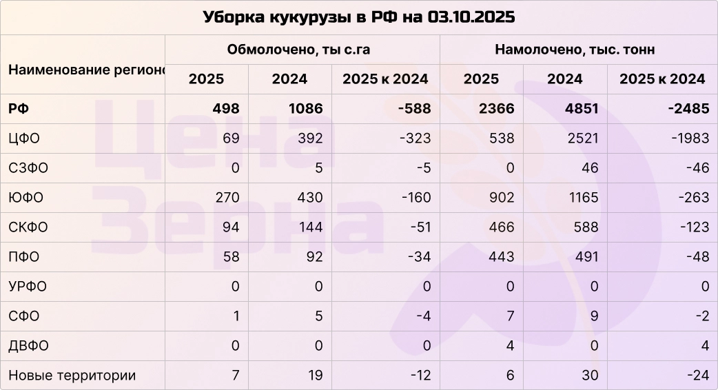 Обмолочено уже почти 20% посевных площадей под кукурузу. Темпы уборки в два раза ниже по сравнению с прошлым годом, однако средняя урожайность немного превышает прошлогоднюю: 47,5 ц/га против 44,7 ц/га. На сегодняшний день намолочено около 2,5 млн тонн зерна. Потери урожайности фиксируются пока только на новых территориях. В остальных регионах урожай показывает лучшие результаты по сравнению с прошлым годом.
