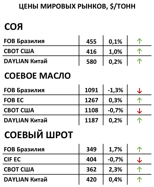11 ноября в РФ намолочено 8,8 млн.т сои, остаток к уборке — около 0,5 млн.га (примерно 10% площадей, преимущественно в ЦФО и Сибири). Итоговый урожай оценивается в 9,35 млн.т. Влажность сои высокая. Закупки продолжаются, однако снижение цен замедлилось. Цены близки к нижней точке рентабельности для фермеров, что может снизить посевные площади на 2026 год. В 2026–2027 годах должно завершиться строительство российских МЭЗов по переработке сои, и сокращение площадей негативно скажется на отрасли.