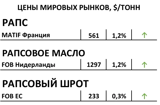 Ликвидность рапса в западных регионах РФ низкая, закупки ограничены. Продавцы ожидают роста цен во второй половине сезона. В Сибири завершение уборки совпадает с сезонной корректировкой цен и снижением предложения рапса. Цена рапсового масла в Китае — важный фактор российского ценообразования — за последние недели была очень волатильной: биржевые котировки почти отбили падение, но все же ожидается снижение цен. Важную роль играют торговые отношения Китая и Канады, а также объем импорта канадской канолы в Китай.