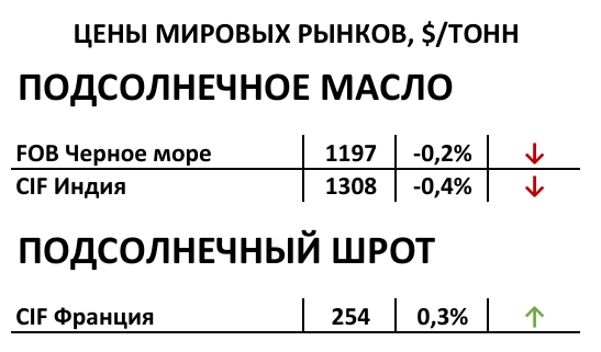 Мировое снижение цен на пальмовое масло охладило рынок растительных масел, но на текущих уровнях возможен разворот цен по пальмовому маслу. Обвал котировок подсолнечного с 1250 до 1220 долларов FOB РФ уже создает трудности в России. Несмотря на рост производства и экспорта, заводы работают с низкой рентабельностью и нехваткой сырья. Повышение экспортной пошлины с 7 до 9 тысяч рублей также ускоряет дальнейшее снижение цен на подсолнечное масло.