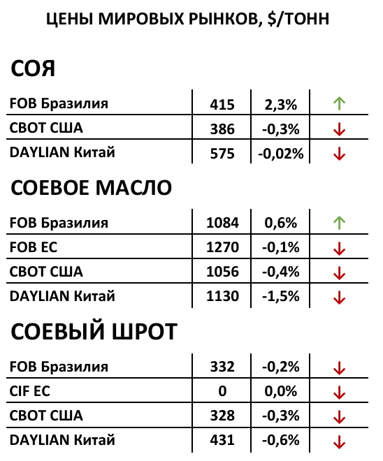 На мировом рынке цены на сою и шрот в первой половине декабря значительно снизились после ноябрьского роста, связанного с договорённостями США и Китая, реализуемыми частично. В Южной Америке погодные условия способствуют сохранению и повышению оценок производства. В 2026 году предложение сою будет очень высоким, что давит на цены. Бразилия завершает посевную, а фермеры Аргентины засеяли около 60% планируемых площадей.