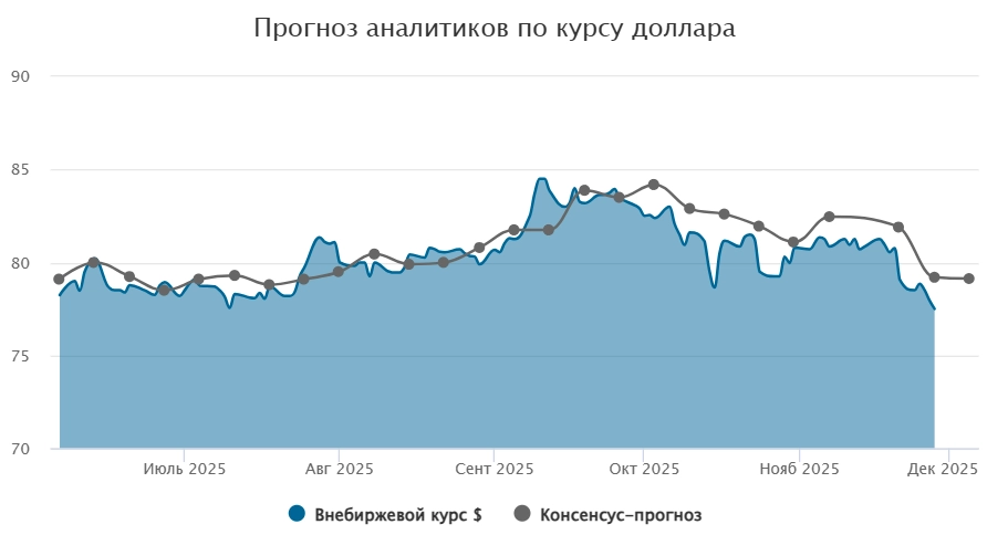 Вторую неделю подряд рубль уверенно укрепляется по отношению к мировым валютам. По итогам пятничных торгов внебиржевой курс доллара снизился до 77,5 руб./$, что на 1,7 руб. ниже прошлой недели. Официальный курс по данным Банка России — 78,23 руб./$, вырос лишь на 0,8 руб. Причинами укрепления являются надежды на урегулирование российского-украинского конфликта и избыточное предложение валюты от экспортеров. За ноябрь доллар снизился почти на 4%, за три месяца — на 6,4%. Укрепление связано с высокими процентными ставками в России, и, скорее всего, продолжится в начале декабря. В дальнейшем динамика зависит от политики Банка России: мягкая риторика может привести к умеренному ослаблению рубля, жесткая — к его дальнейшему снижению.
