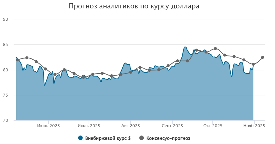 Минувшую неделю доллар укрепился на внебиржевом рынке, достигнув 80,89 руб./$. — почти на 90 копеек выше конца предыдущей недели. Официальный курс банка России снизился на 8 копеек, до 80,97 руб./дол. Ослабление рубля связывают с уменьшением валютных продаж экспортерами после уплаты налогов. В течение недели произошёл плавный тренд к ослаблению рубля: во второй половине диапазон курса к юаню сместился в верхнюю часть 11–11,5 руб./CNY, а на внебиржевом рынке доллар укрепился чуть выше 80 руб./$. В целом наблюдается повышенная волатильность. На следующую неделю ожидается закрепление в диапазоне 11–11,5 руб./CNY и чуть выше 80 руб./$., при сохранении сезонной активности импортеров и возможном сокращении валютных продаж Минфином в ноябре, поскольку платежи по нефтегазовым сборам в октябре были хорошими.
