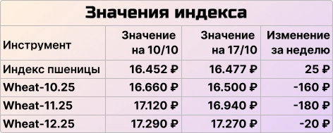 Цены на рынке застопорились. Согласно текущим ожиданиям, уровень фьючерсов оценивается в районе 16 500 рублей на конец октября и около 17 000 рублей — на конец ноября – начало декабря. Предпосылок для роста цен не наблюдается: котировки фьючерсов продолжают снижаться, курс доллара не растет.